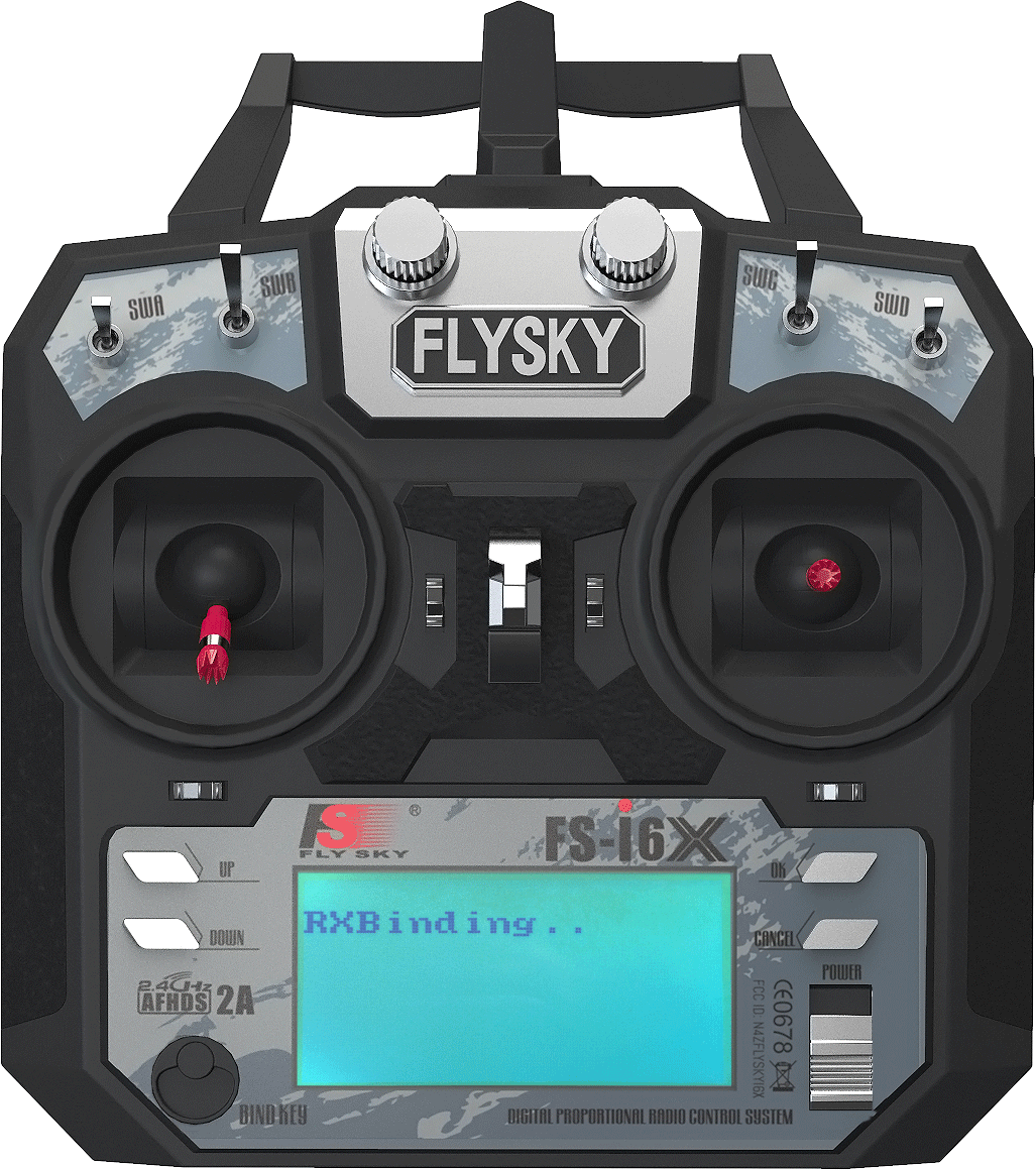 - Power on the transmitter. Make sure the left stick is in the bottom position.