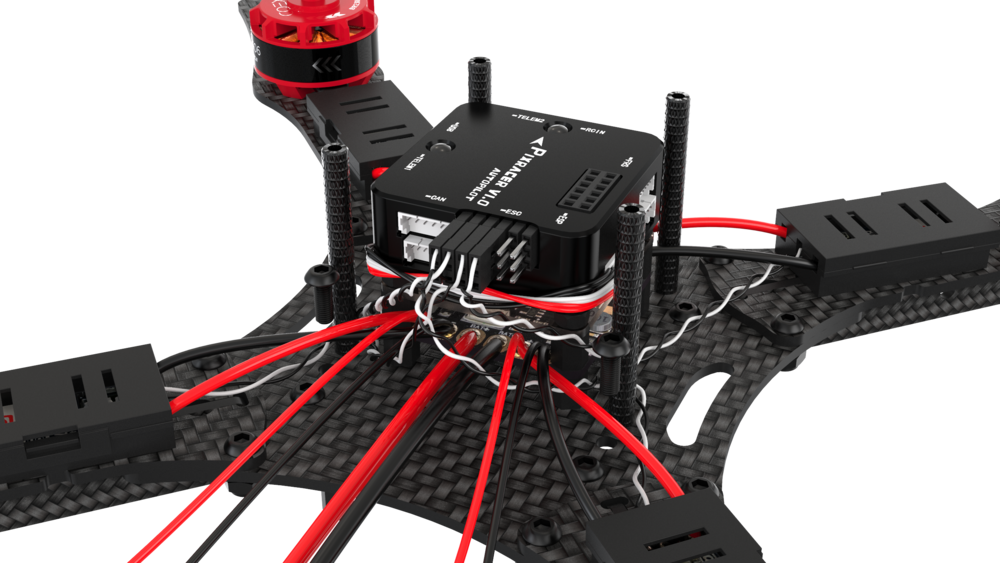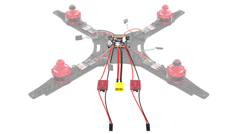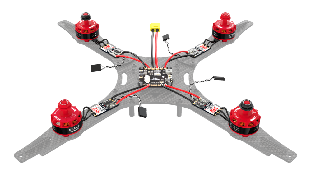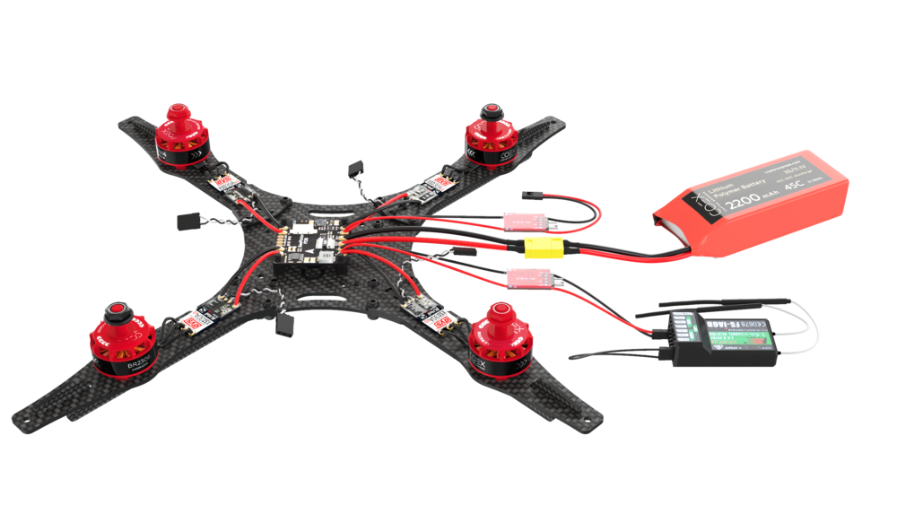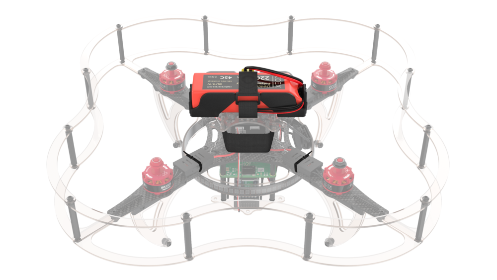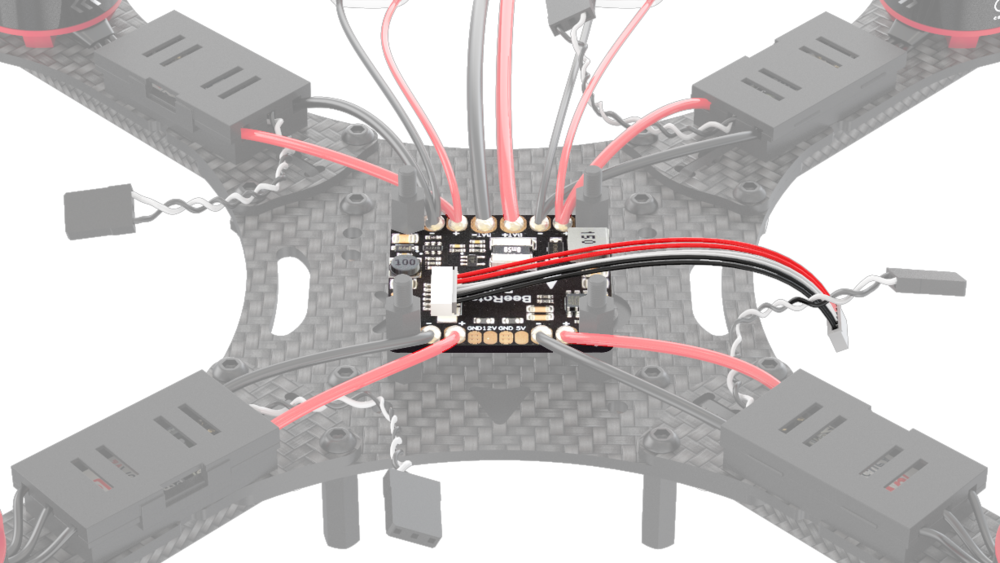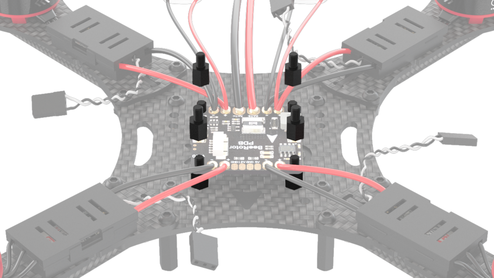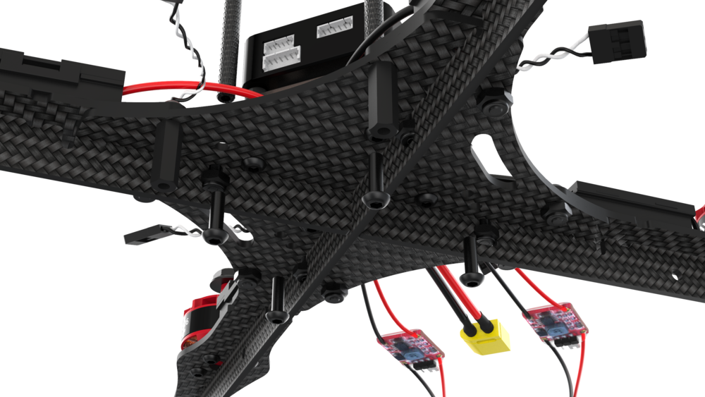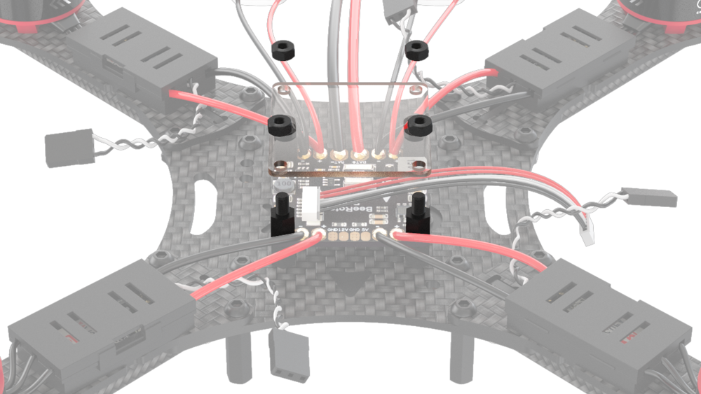 - All wires from the PDB and flight controller should be tucked under a velcro strap wound around aluminum spacers.