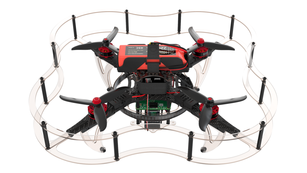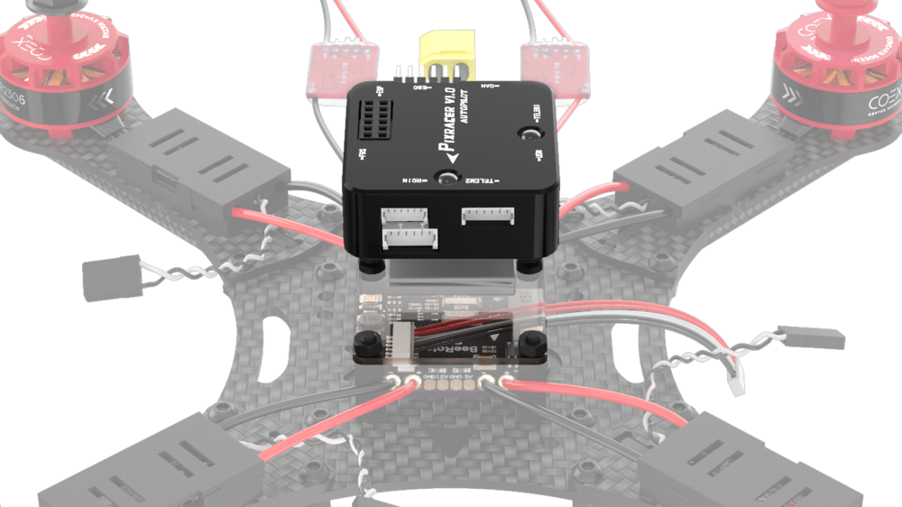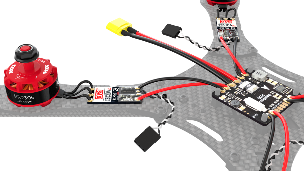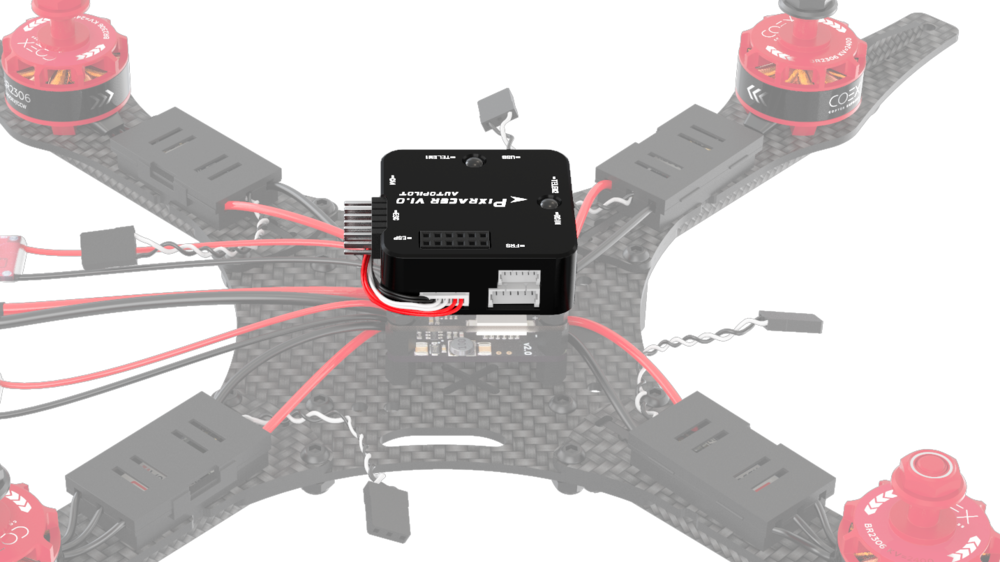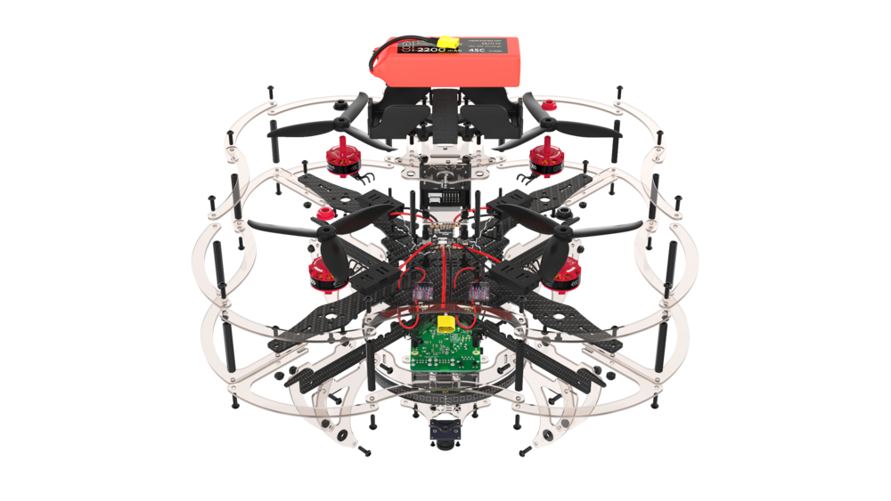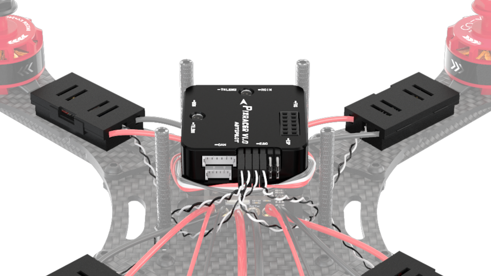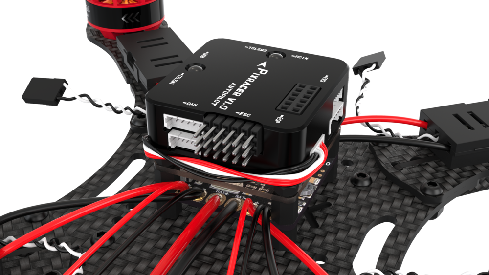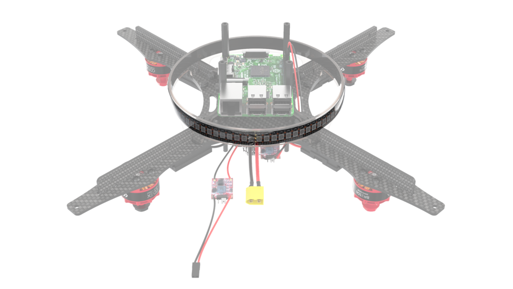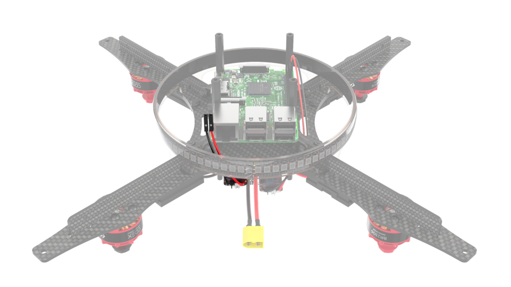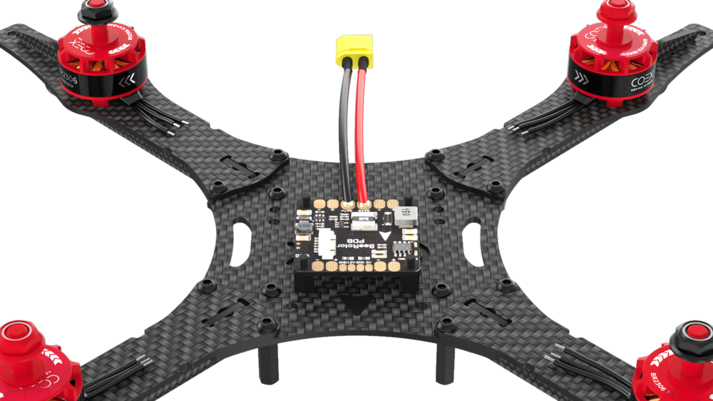 - All wires from the PDB and flight controller should be tucked under a velcro strap wound around aluminum spacers.