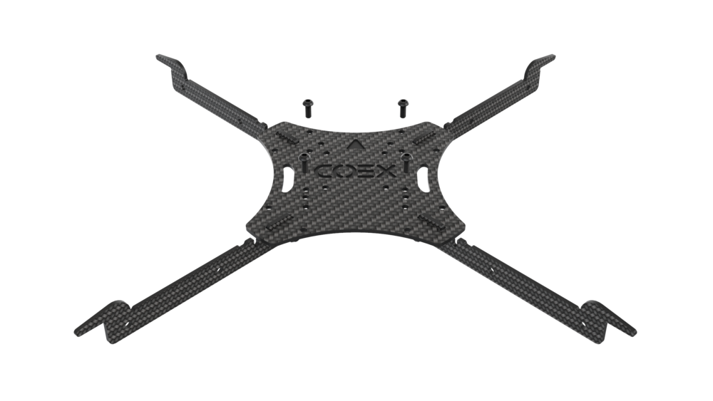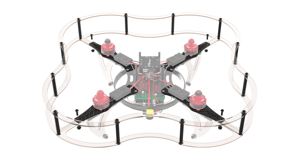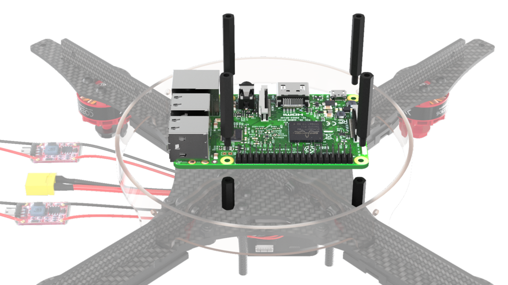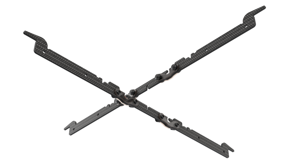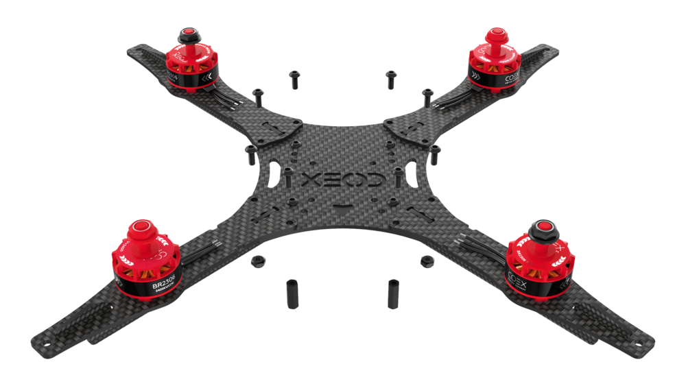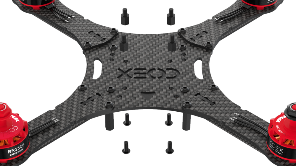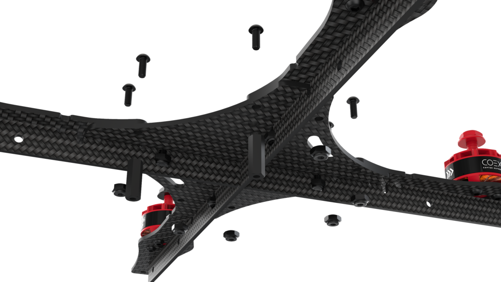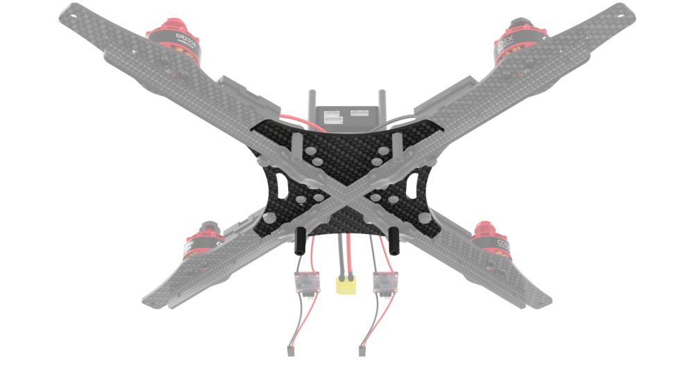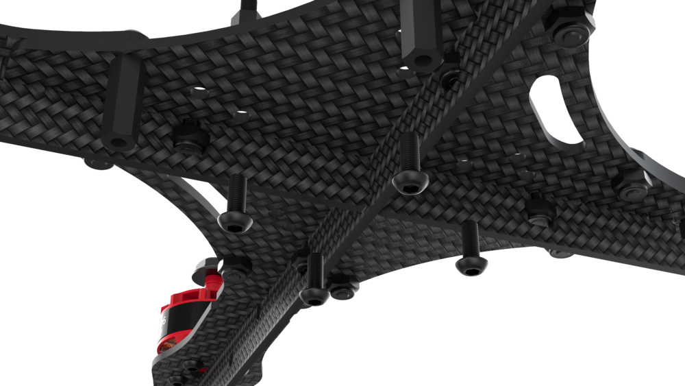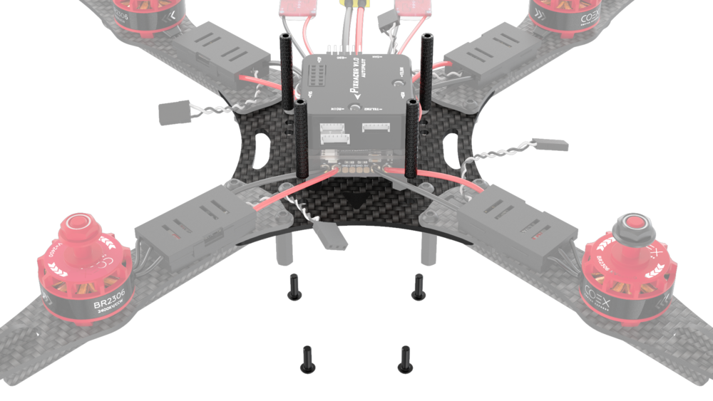 Attach four 40 mm aluminum spacers to the top carbon deck using M3x10 screws.