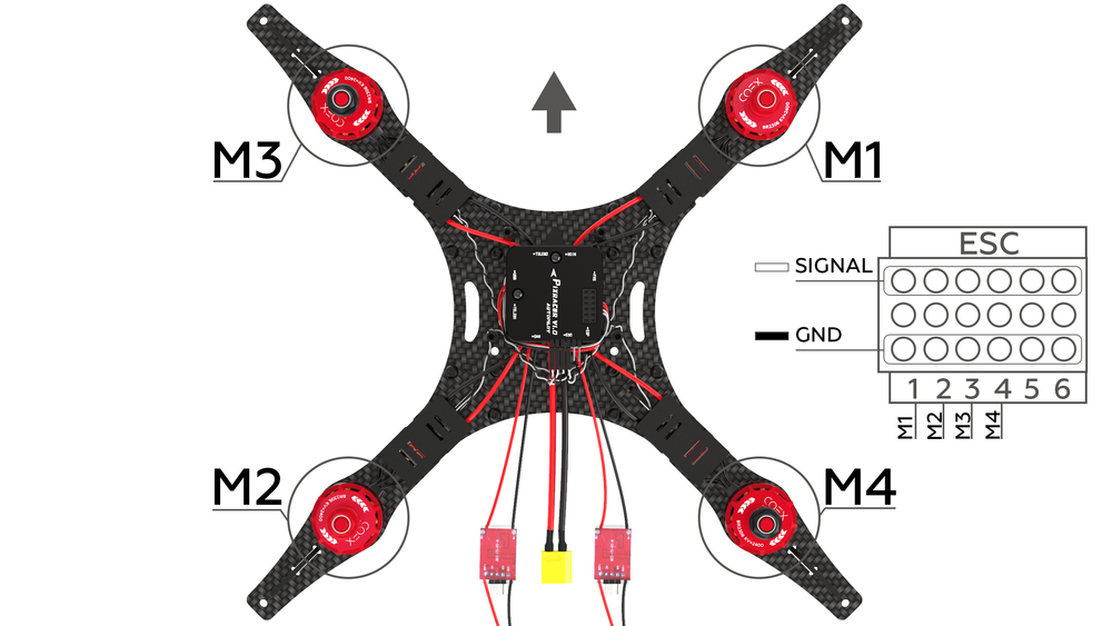 - Connect the signal wires from the ESC to CH3 pins on the output. The white wire should go to the top pin, the black one should go to the bottom one.
