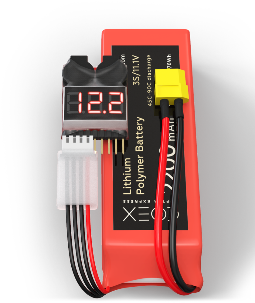 Be sure to install and setup the voltage indicator before flying, so as not to overdischarge the battery. To configure the indicator, use the button located at its base. The displayed numbers during setup indicate the minimum possible voltage in each cell of the battery, the recommended value is 3.5.