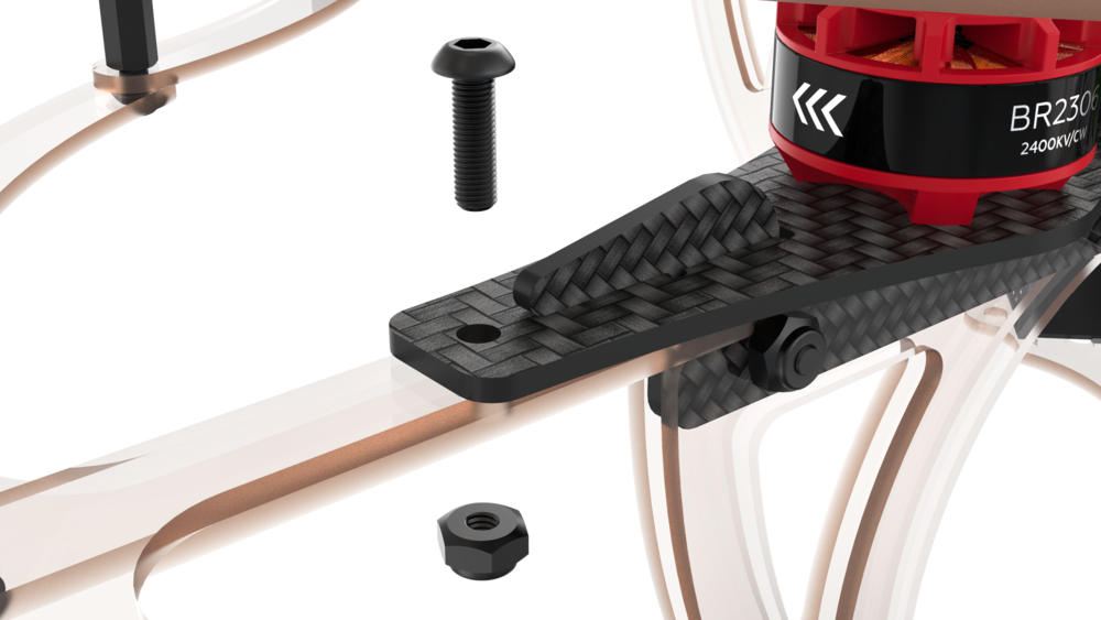Note the motor nut colors when installing the arms. Motors with red nuts should be placed on the front right and back left arms, with black ones - on the front left and back right arms.