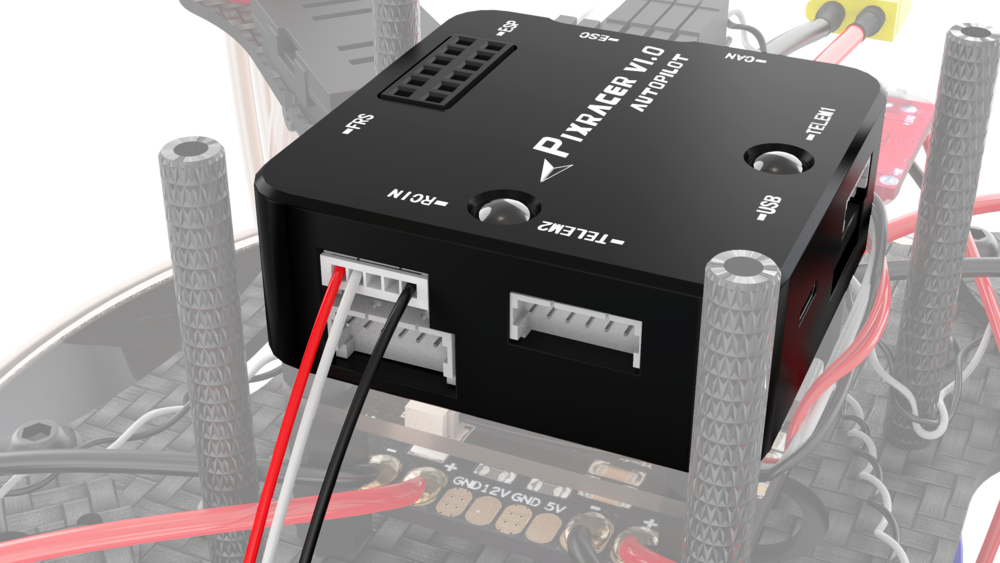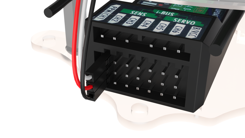 - Connect the RC receiver to the 5 V BEC output. Connect the black wire into one of the bottom pins and the red wire to one of the central pins.