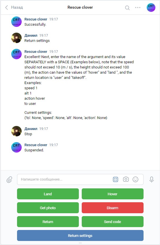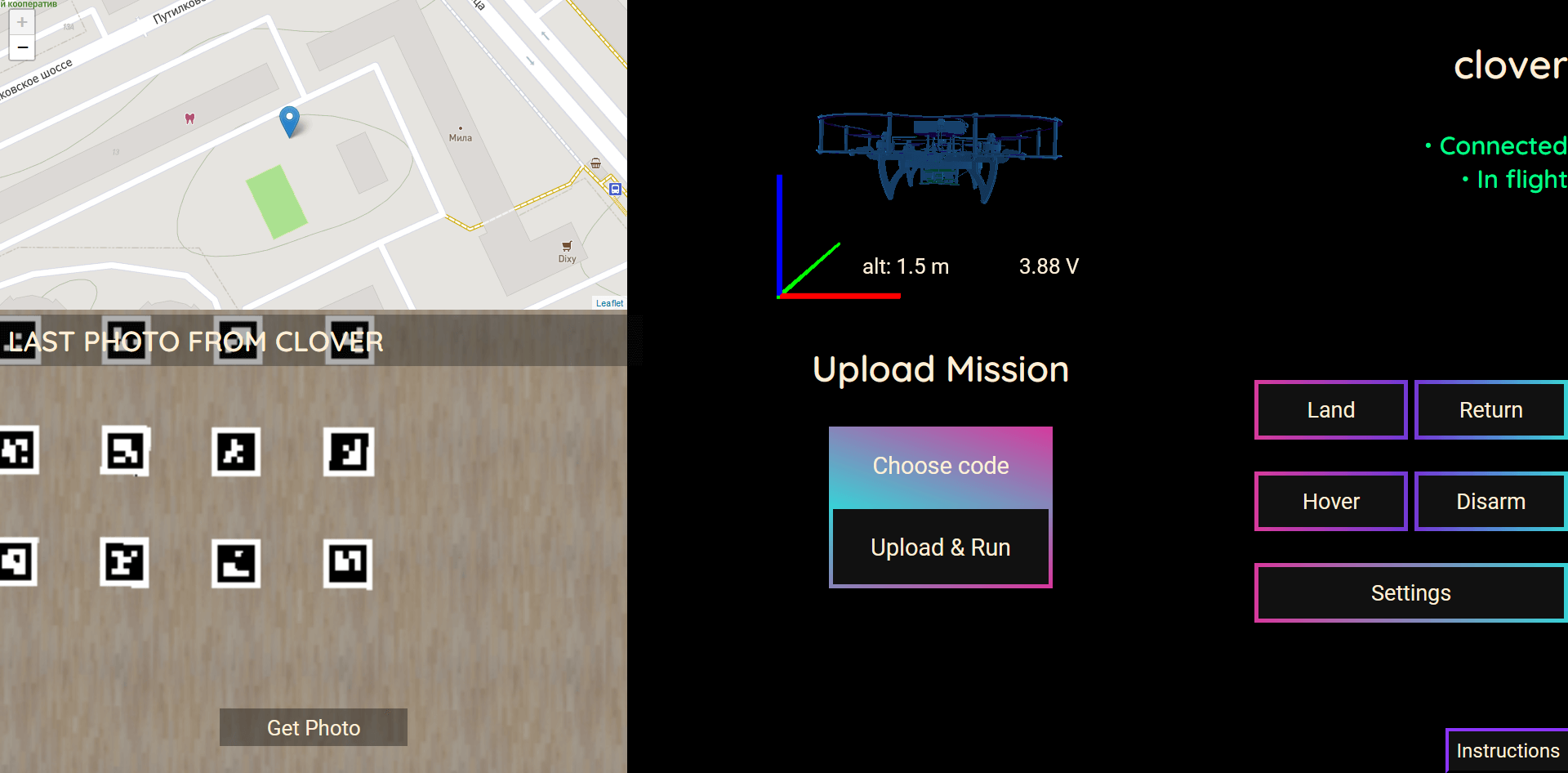 On the website there are several commands for controlling the drone. “Get photo” allows you to get an image from the drone camera. The “Land” button lands the drone. The "Return" command returns drone to the operator, according to GPS coordinates (this requires a stable connection of the drone with 10 or more satellites). "Hover" makes the drone hover in the air. "Disarm" instantly disables the drone's motors, so you need to be careful with this command. The “Choose Code” and “Upload & Run” buttons allow users to select a code written in Python, upload it to the drone and run it. Also, users will see output of their code and all its errors. There is also interactive map with markers, blue marker the is location of the user, purple marker is the location of his drone. Also, as you can see, there is a real-time visualization of the Clover’s airborne position, as well as its altitude and the average voltage between the battery cells.