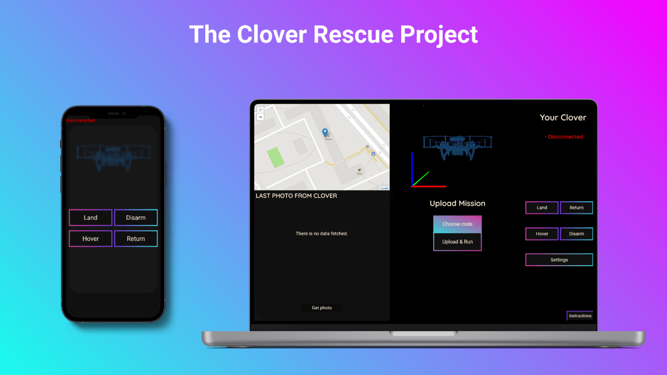 The idea of this project came immediately, it lies on the surface. A system that makes situations where pilots cannot find their flown away drone or stop it at full speed flying into a wall, a thing of the past, is something that pilots have been missing for a long time. The key feature of our software is that users can manage their Clover from anywhere in the world, this software replaces FTP and SSH (users can upload the code to their drone and run it directly from our site). Also, if radio communication with the Clover is lost, it can be returned to the user's or takeoff location with just one click. Moreover, the user can monitor the status in realtime, as well as location, camera data, and airborne position data of the drone. There are also functions that can be useful in emergency situations, such as landing, hovering and disarming the drone remotely from our website. A mobile version of the site with full functionality is also available!