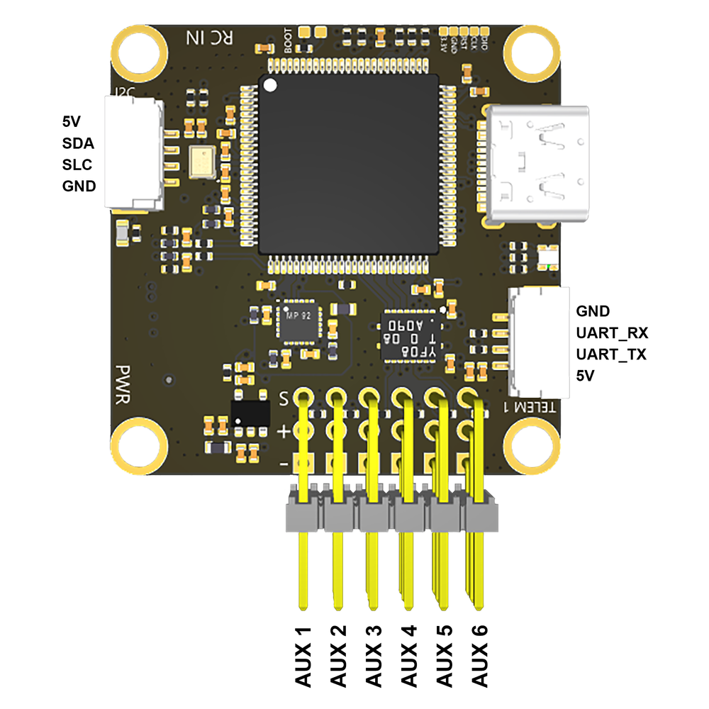 - RC IN (JST-GH 4 pin) – RC input port with RSSI pin. Supports PPM and S.BUS protocols.