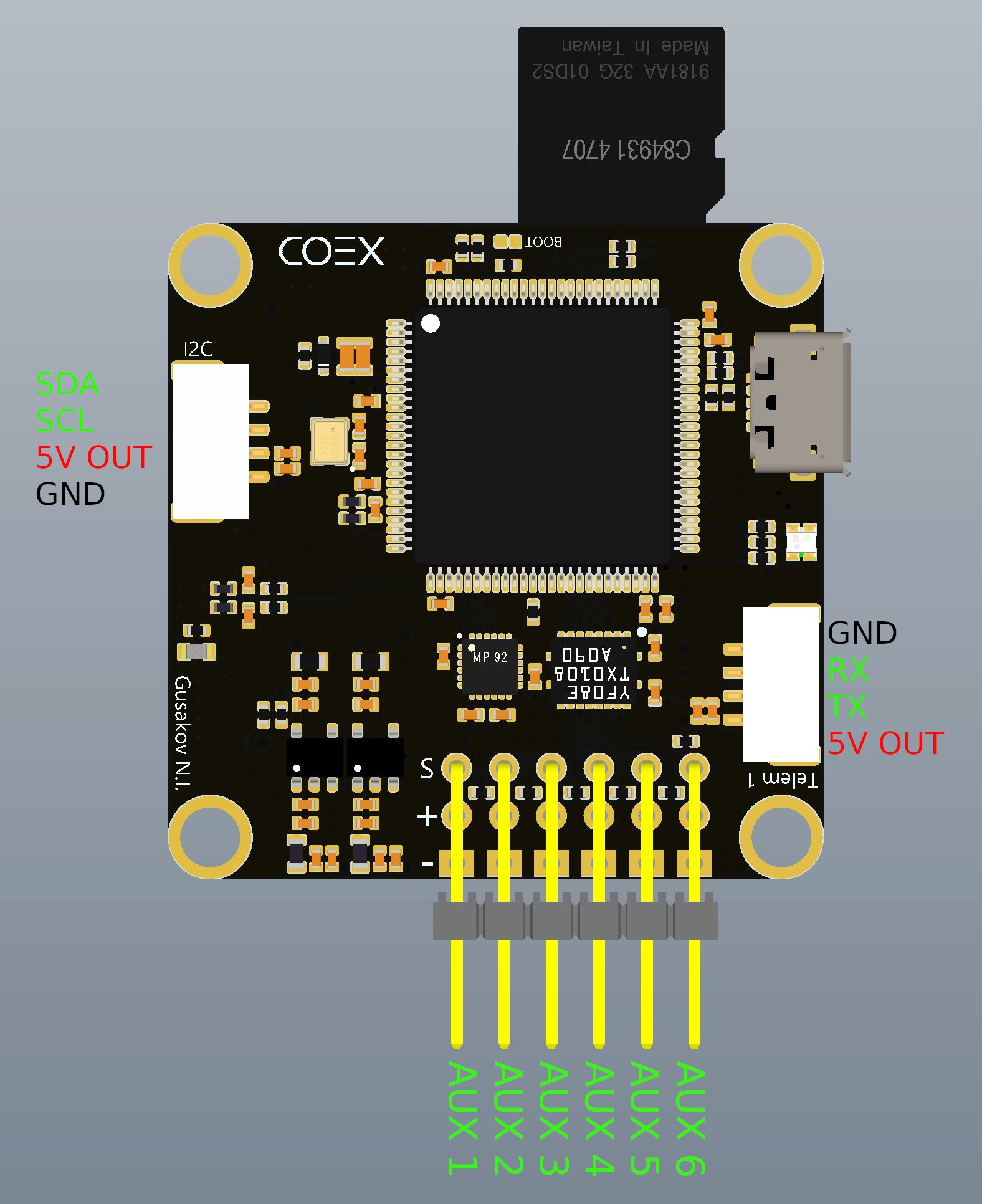 - PWR (JST-GH 6 pin) – port for PDB connection (COEX PDB or compatible), with two power lanes, two ground lanes, and voltage and current sensor inputs.