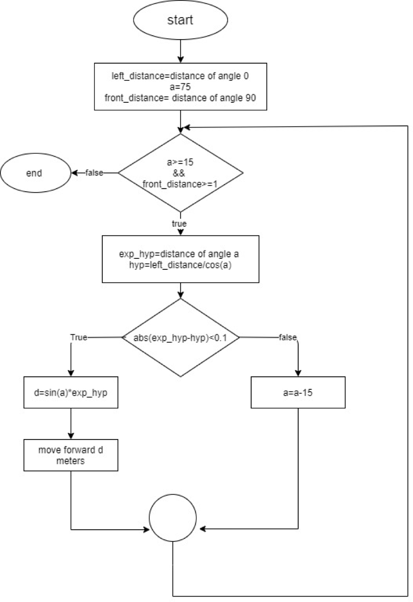 This function was implemented to safely move the drone forward without hitting a wall, or without skipping an outer corner. The logic behind this algorithm is that it uses the concept of the right angle, and multiple readings which correspond to different angles to measure the safe distances. The bellow flow chat demonstrates the logic of that algorithm in details.