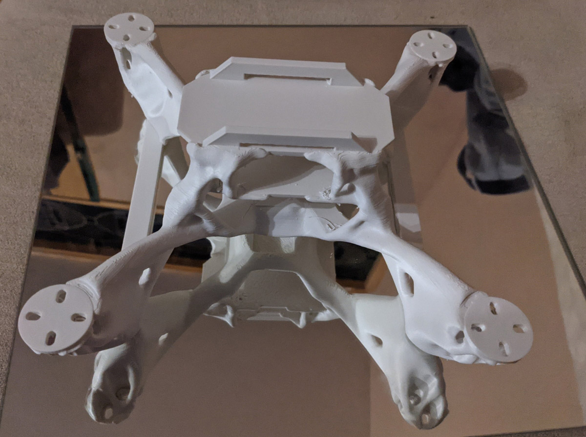 In our work for this years competition we presented a new way to design and manufacture drone frames. By utilizing state of the art methods of CAD programs we are able to optimize the weight and shape of drone frames in a way that for the first time it is feasible to 3D print them. In total we have printed around 10 frames and presented a few of them above and the challenges we faced with them. This iterative process to frame design was only possible due to the fact that only a 3D printer is needed and the filament being very cheap. Due to the open source nature of the project and this report giving a short introduction into generative design, we hope that many people feel inspired to check out this new method of designing and producing drone frames.