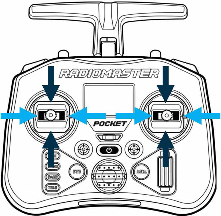 Управление дроном происходит с помощью двух стиков на аппаратуре. По умолчанию левый стик отвечает за газ и рысканье, а правый за крен и тангаж. Данные термины используются для всех летательных аппаратов, от самолетов до квадрокоптеров