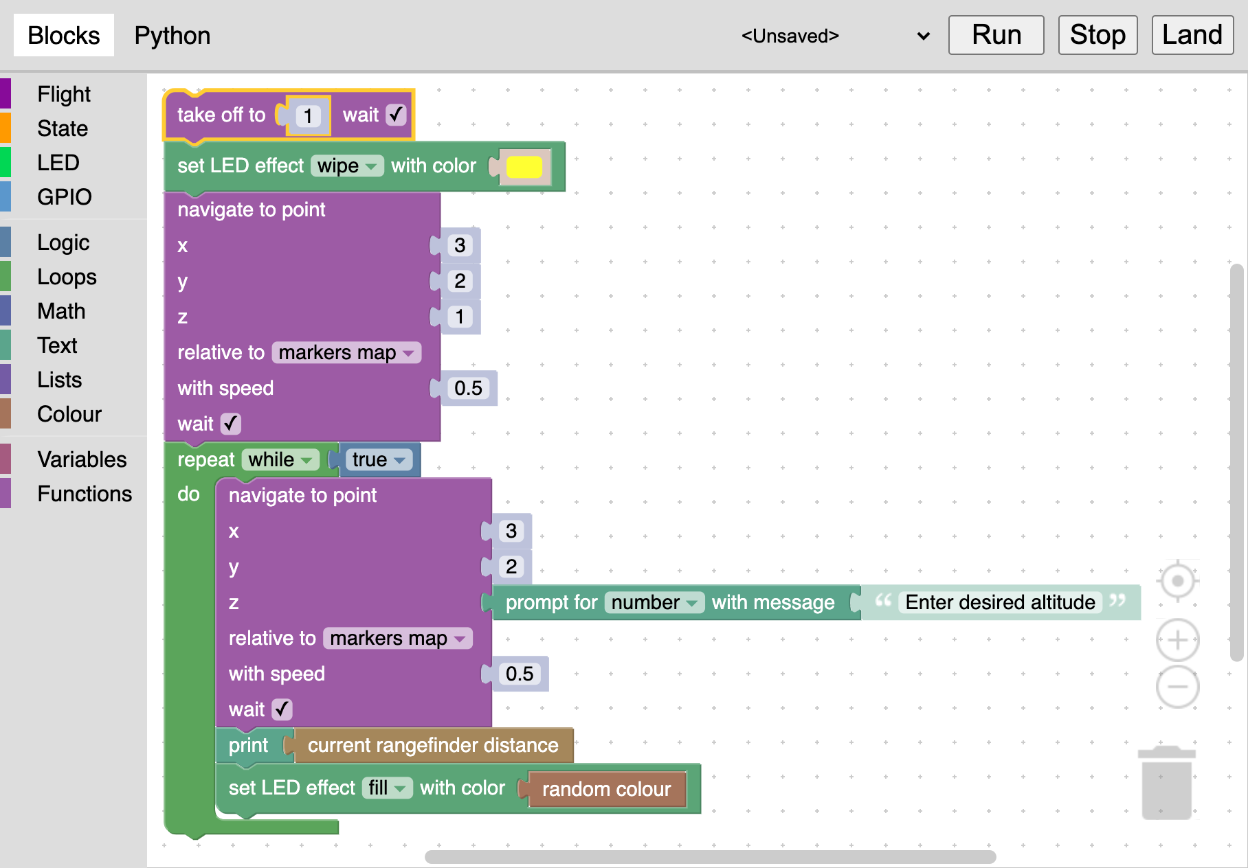 Соберите необходимую программу из блоков в меню слева а затем нажмите кнопку Run для ее запуска. Также вы можете просмотреть сгенерированный код на языке Python, переключившись во вкладку Python.