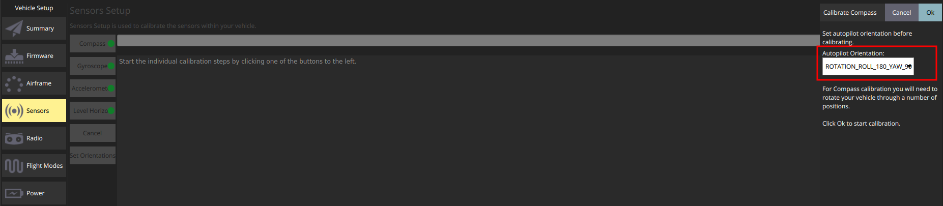 При использовании полетного контроллера COEX Pix перед калибровкой датчиков вам стоит обратить внимание, что в графе Autopilot orientation вы должны выбрать параметр ROTATION_ROLL_180_YAW_90