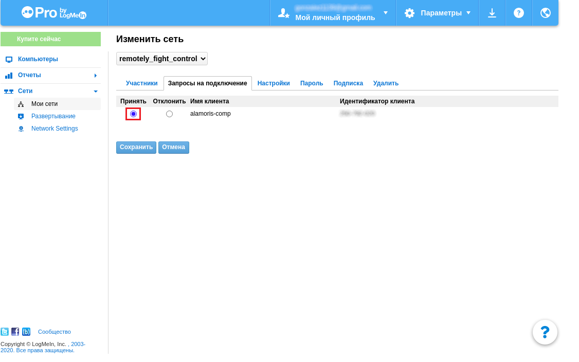 Подтвердите подключение к сети в меню Изменить сеть, во вкладке Запросы на подключение.