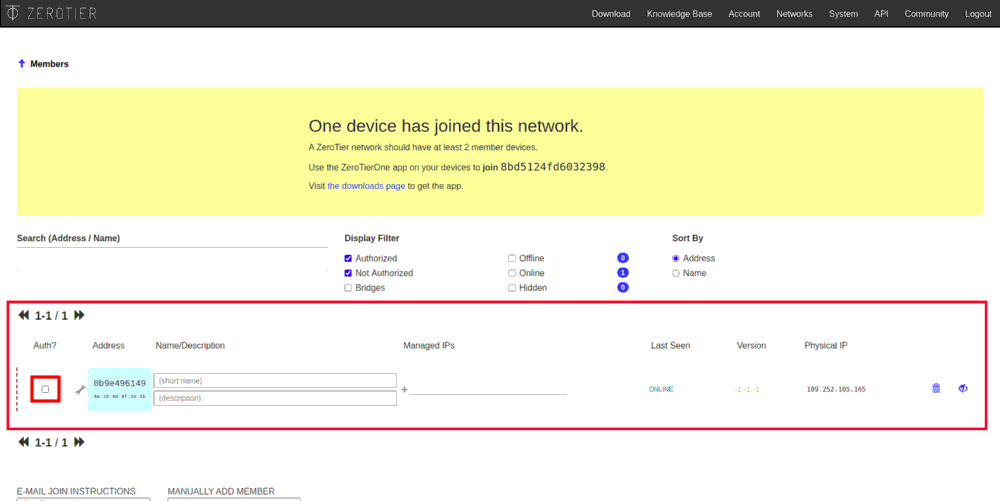 Устройства подключенные к сети будут отображаться в данной графе, для того, чтобы позволить им подключиться к сети, активируйте чекбокс Auth?. При этом, подключенному устройству автоматически выдастся внутренний IP адрес, в дальнейшем он будет использоваться для связи с данным устройством.