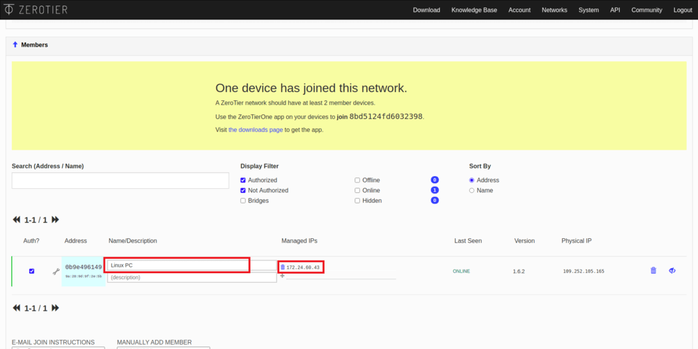 Убедитесь, что ZeroTier работает и имеет соединение с сетью на дроне и управляющем устройстве. Для этого убедитесь, что интересующие вас устройства имеют статус Online.